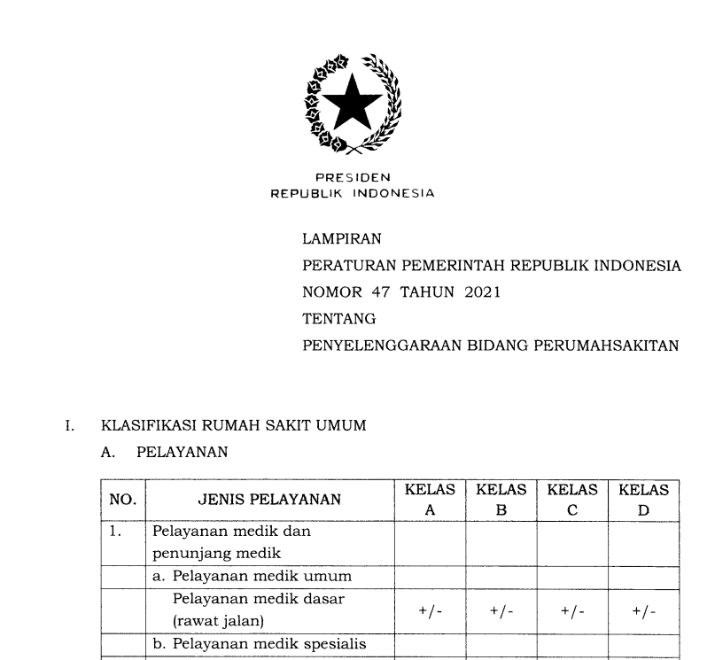 PP No. 47 Tahun 2021 Tentang Penyelenggaraan Bidang Perumahsakitan - Lampiran